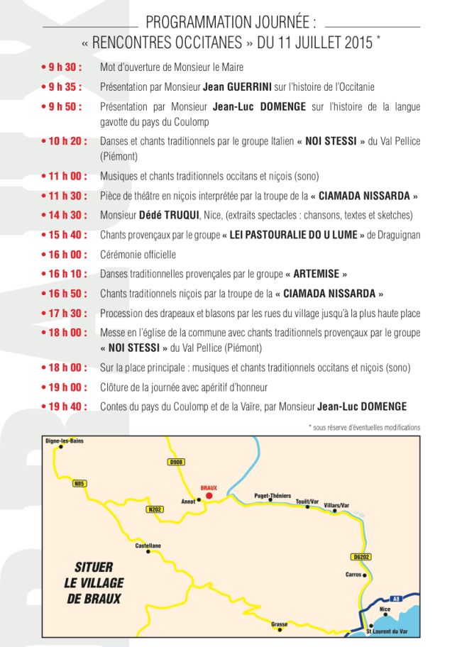 Le 11 juillet prochain Braux invite à ses premières "Rencontres occitanes". Au programme des débats et conférences : sur le gavot, variété locale de l'occitan, et des chants, danses et pièces de théâtre.