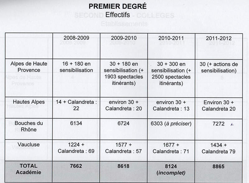C’est la réponse que font depuis dix ans tous les recteurs de l’Académie d’Aix-Marseille, alors même que les statistiques montrent que le nombre d’élèves augmente dans les cours de provençal, surtout, au moins dans le premier degré, l'Alpin d’Oc connaissant lui une situation plus difficile. On peut penser que ce sont les services académiques qui proposent la même réponse à tous les recteurs arrivant, quelles que soit l’évolution de la demande et de l’offre d’occitan dans l’Académie.