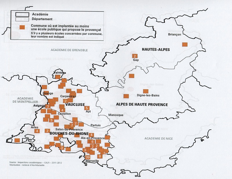 On sait que c’est très loin d’être le cas. Seuls quelques établissements proposent un cours d’occitan, et la continuité territoriale et sectorielle entre écoles primaires, collèges et lycées n’est pas la règle. Bien des collèges proposant du provençal ne conduisent pas dans un lycée du même secteur qui en propose, et des secteurs où existe un enseignement du provençal en primaire ne trouvent pas de débouché au collège..